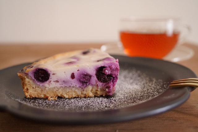 ④型に生地を半分入れて、ブルーベリーをいれる。残りの生地をいれる。軽くガス抜きして、180℃で予熱したオーブンで約35分くらい焼く。冷蔵庫で一晩冷やして完成